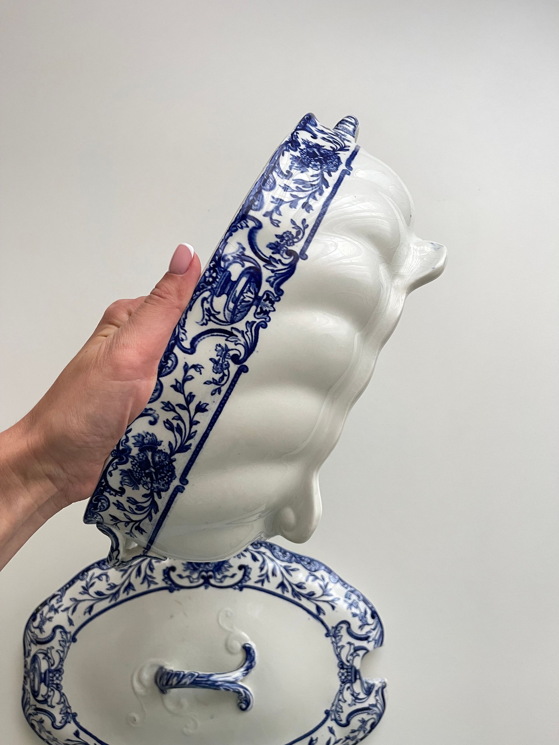 O modelo Athol, com seu delicado padrão azul sob vidrado, reflete o requinte da era vitoriana. Esta peça foi produzida pela prestigiada fábrica Doulton Burslem antes da marca receber o título real e se tornar Royal Doulton.