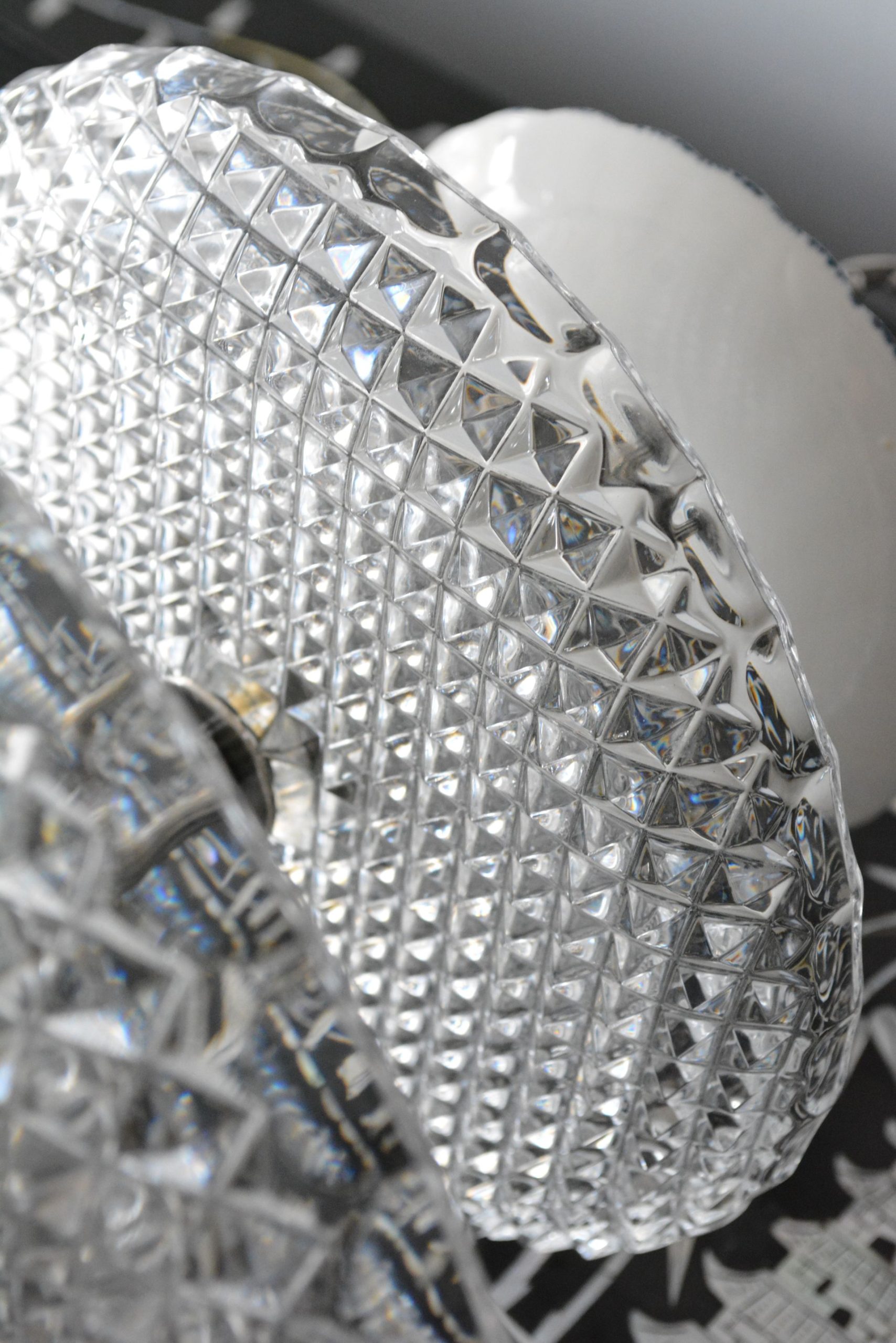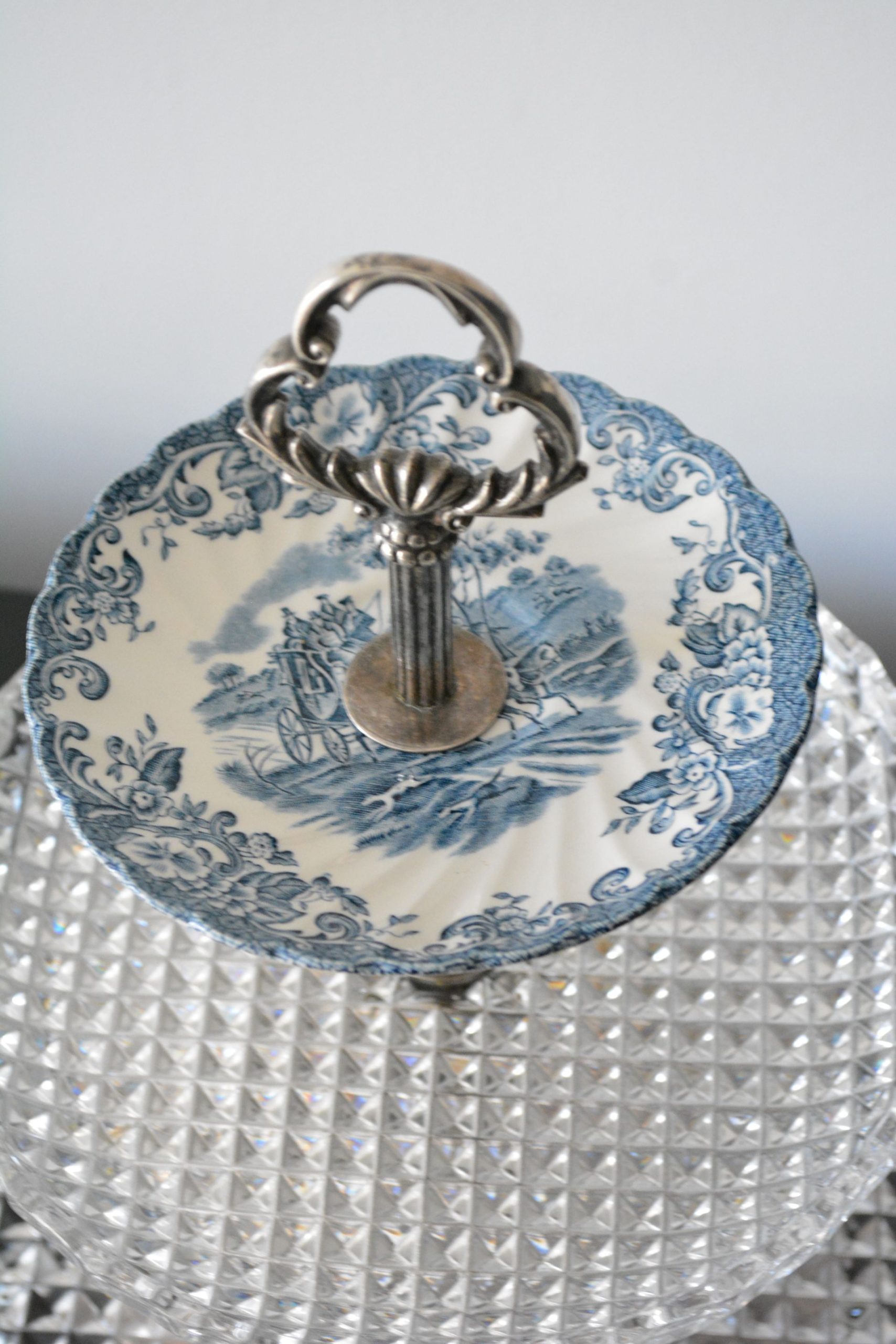 A fruteira em cristal. O terceiro prato azul não é original da fruteira. Os outros pratos são de cristal. O peso é 3.4 kg.