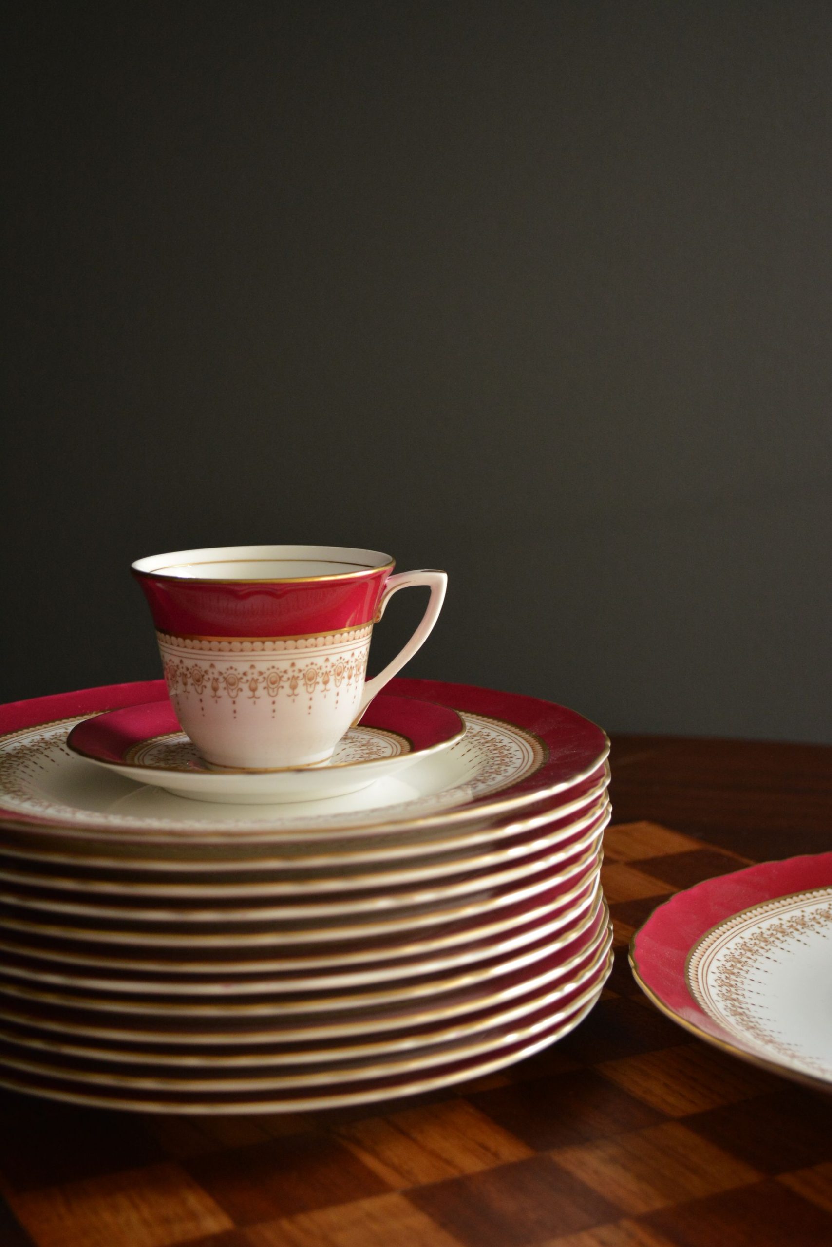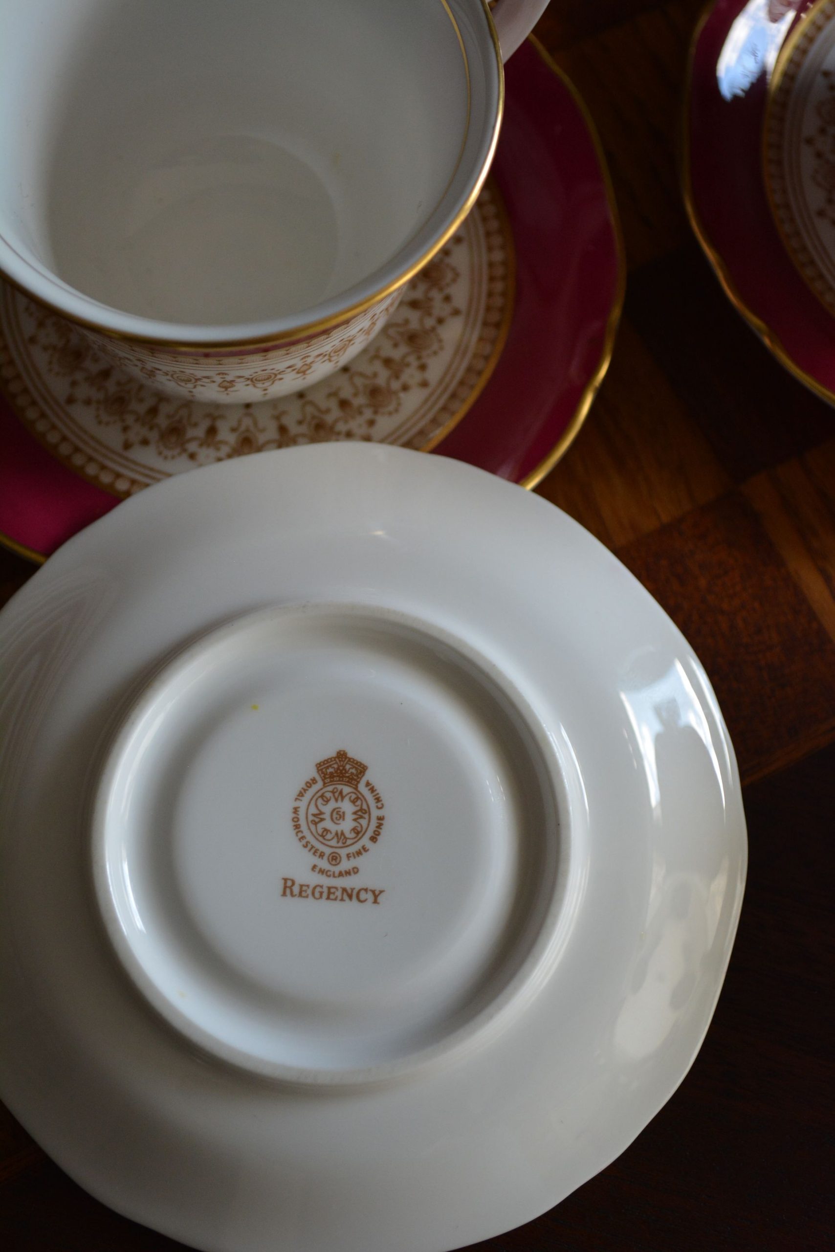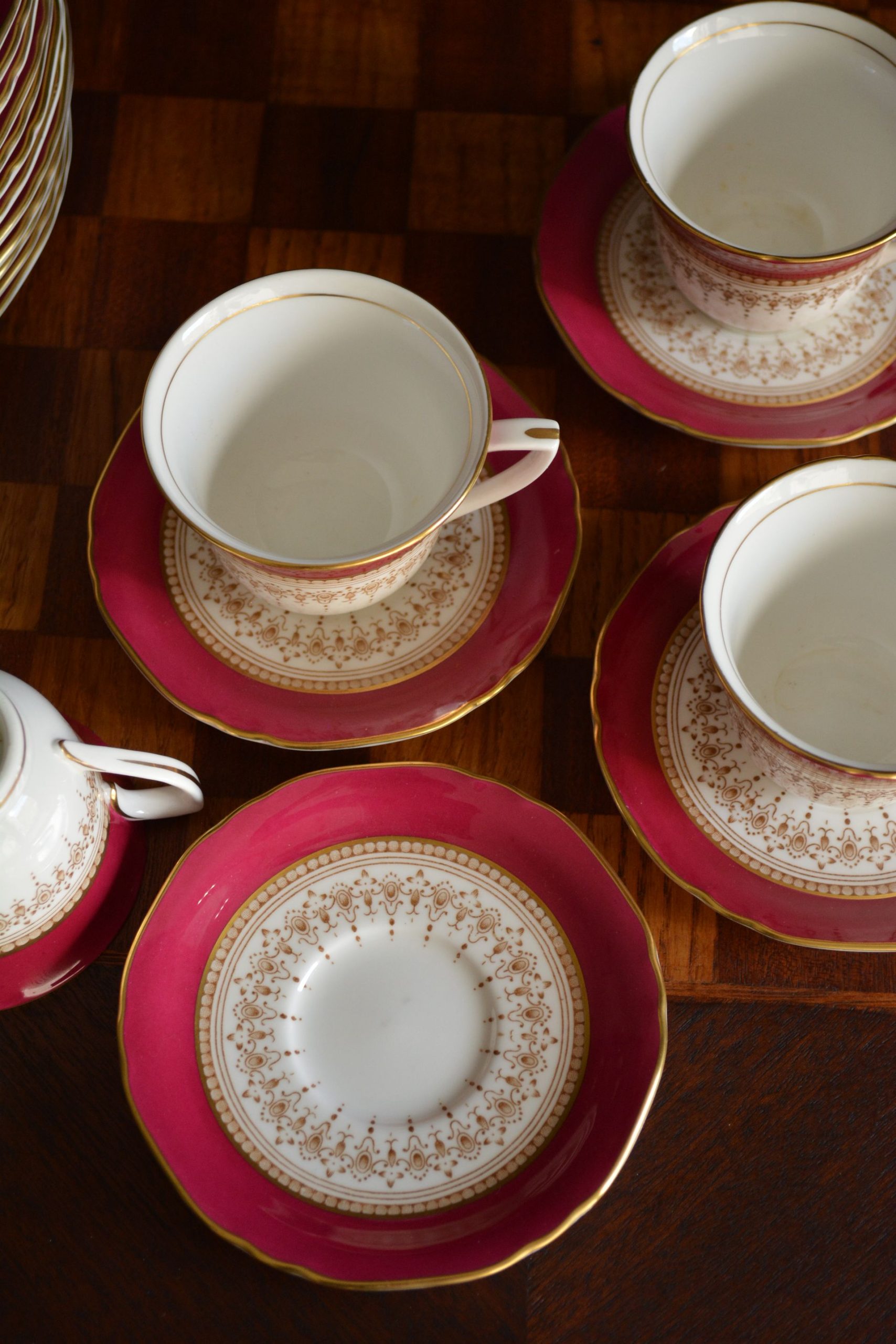 Porcelana de barro de osso em excelente estado. A cor da loiça não é vermelha, é rosa-forte.