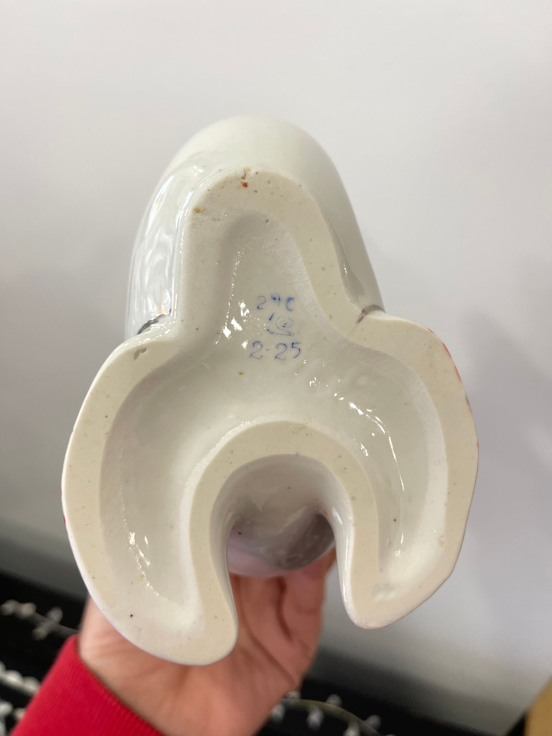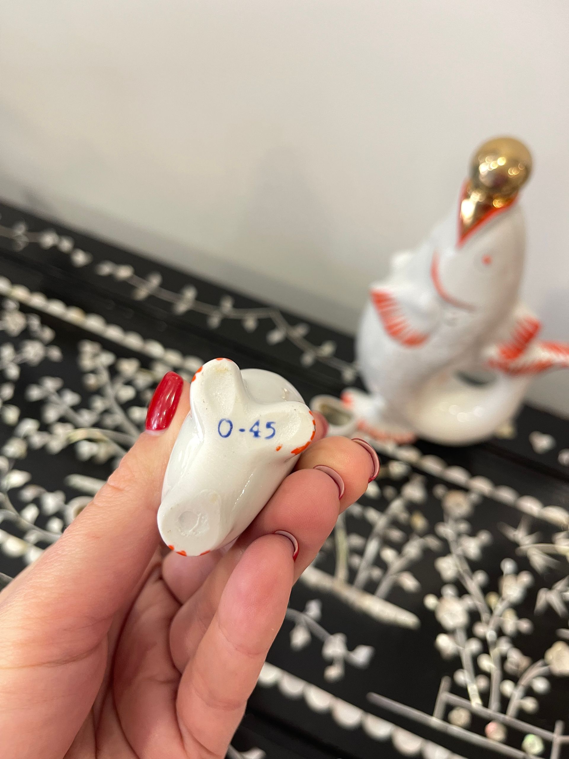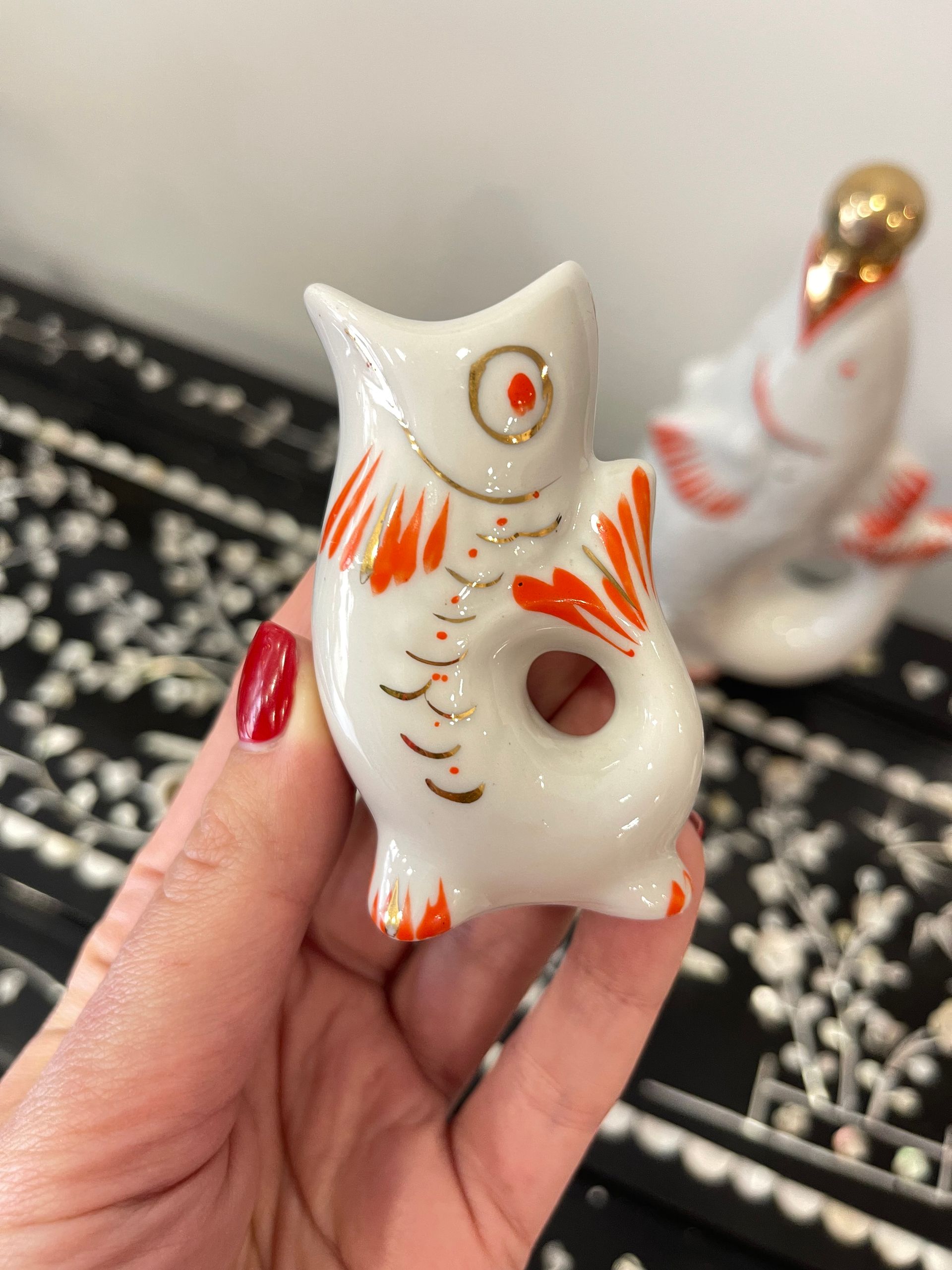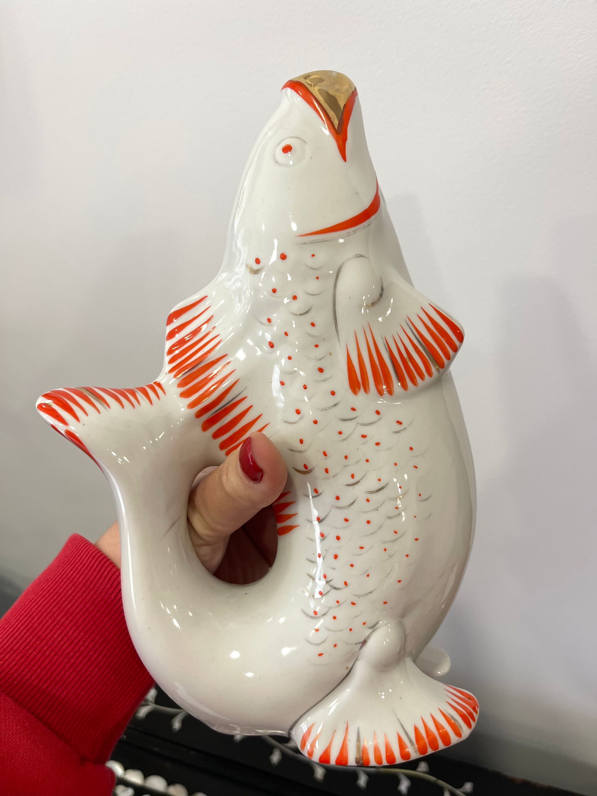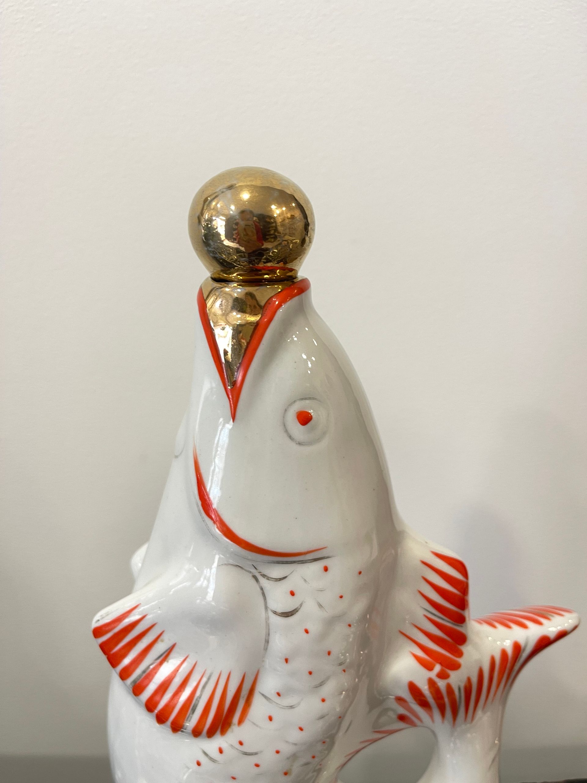Conjunto em porcelana composto por 1 garrafa e 6 copinhos em forma de peixe. Este modelo foi produzido em grande escala na União Soviética entre as décadas de 1960 e 1980, dentro da tradição do porcelana decorativa utilitária peças para uso e, ao mesmo tempo, para exibição.